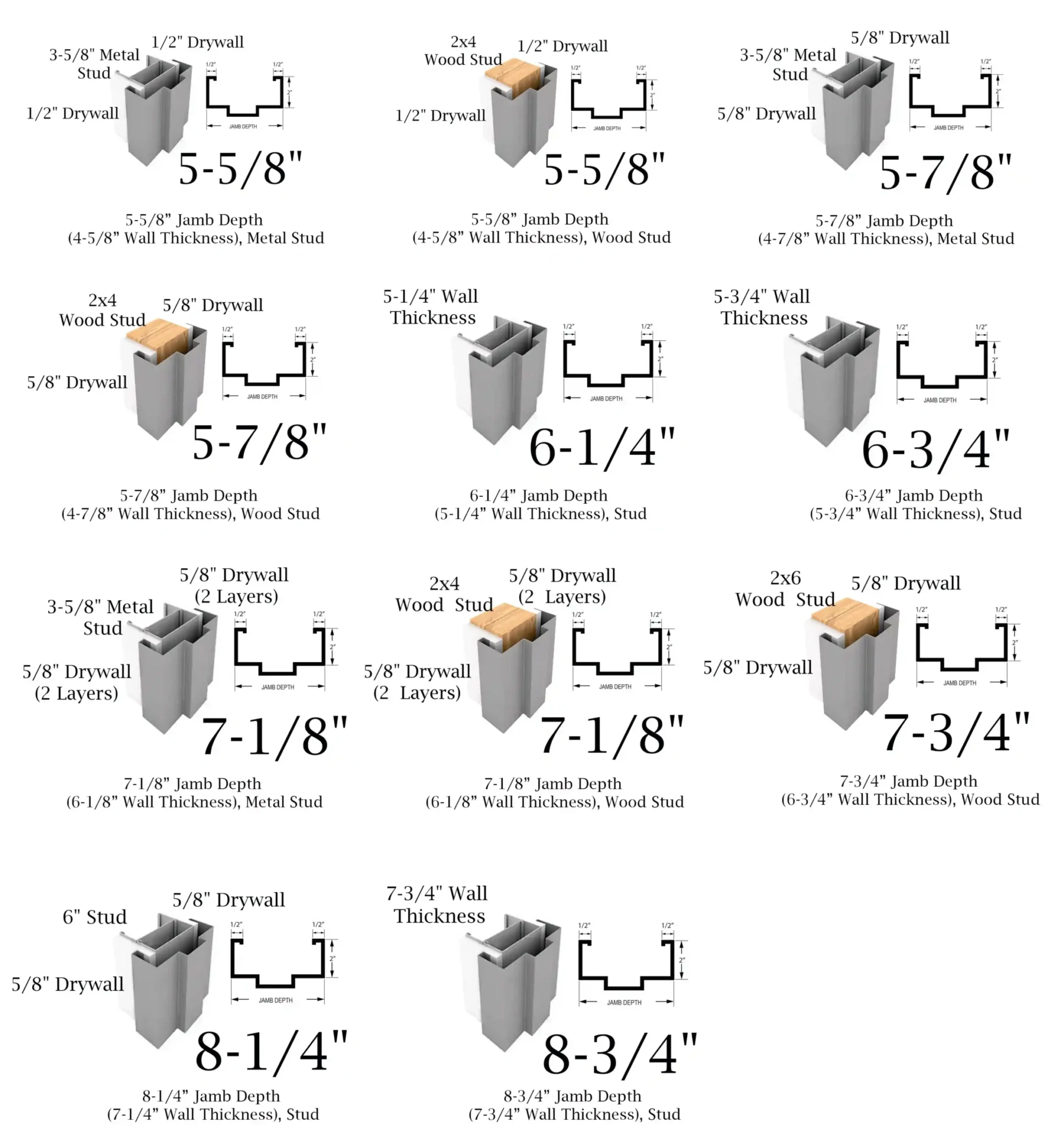 Стандартные наружные дверные коробки обычно имеют толщину от 1 ¾ до 2 дюймов. Эта толщина соответствует большинству спецификаций оборудования, включая замки и петли, обеспечивая совместимость со стандартными наружными дверями.